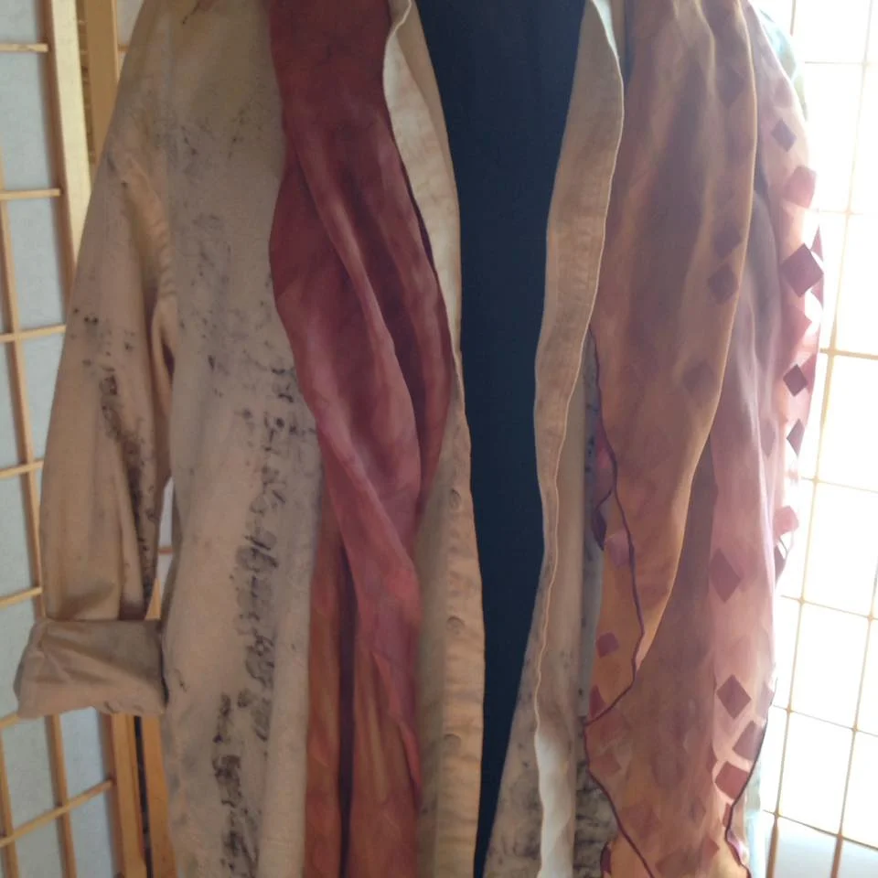 /Recently, I read that we can set an intention without necessarily knowing how we are going to accomplish it. I have had that experience regarding dying silk. There has been considerable interest in creating botanical prints on fabric. I wanted to learn to formulate some of those colors. After several attempts that I considered unsuccessful, I tossed the pieces of the dyed silk aside and moved on. Recently a friend taught me how to do the botanical printing. Another intention I have had in the back of my mind is finding ways to upcycle clothing? After completing a botanical print on an old shirt, I saw the previously dyed silk and layered it with the shirt and was amazed that I had accomplished what I had envisioned without consciously doing it step-by-step.