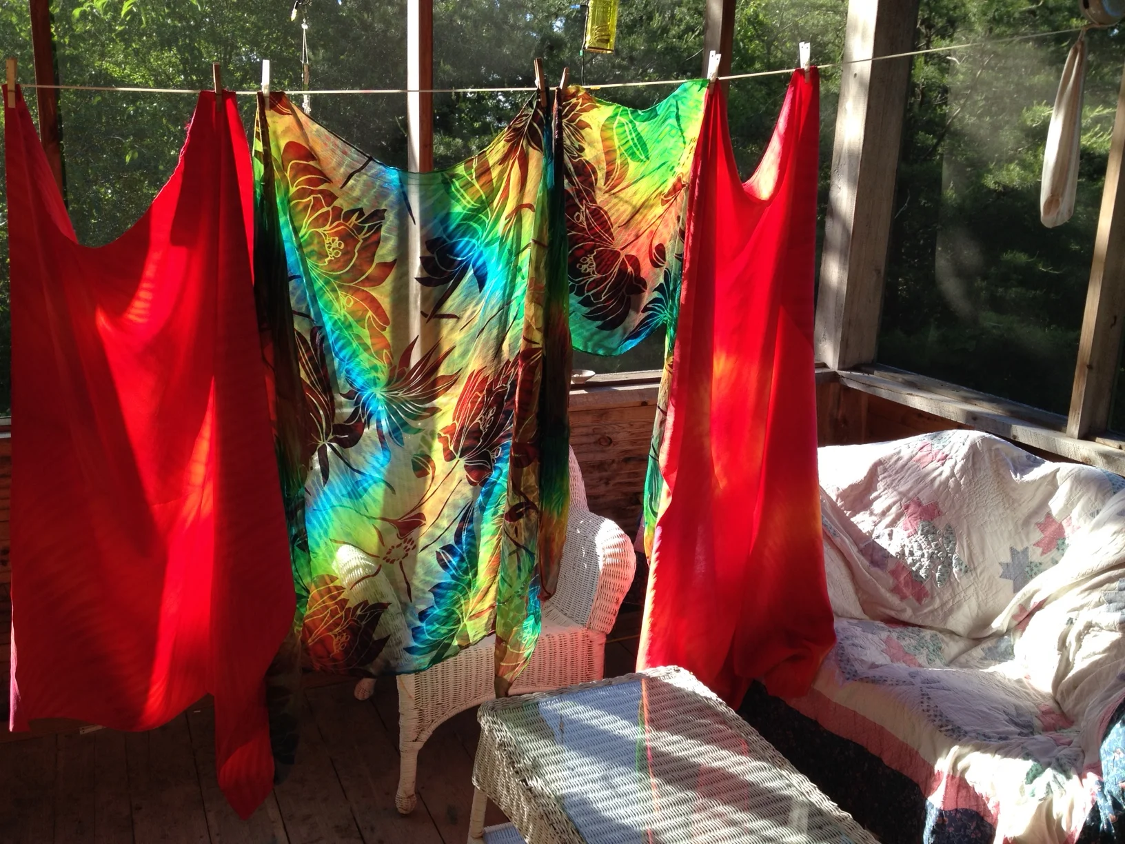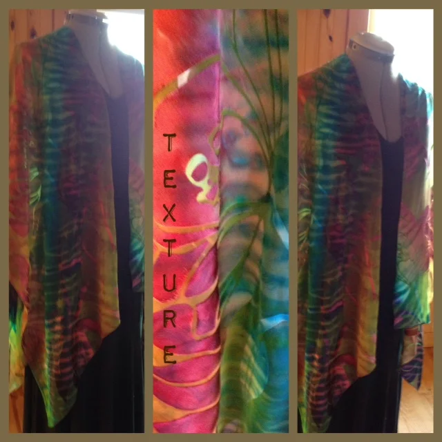 The photo is for effect only. The idea is to be playful. The goal: not busy. Dyeing several pieces in one palette is turning out to be inspiring. Sewing began yesterday. This jacket began as 44 x 44" devore fabric, pole wrapped and dyed using the Vinyl Sulphon pure color dyes in a triad of turquoise, fuchsia and yellow orange. I like using the pure colors in summer. Come fall I will move into tones, then shades for winter.