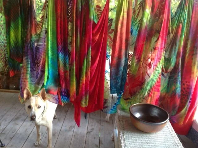The May collection of shibori dyed pieces are complete. Most are pole wrapped. A few are rope wrapped. All pieces are dyed using three colors. I love the variety. Even Highlin' is enjoying the color. The empty bowl symbolizes the next step: sewing a cohesive body of wearable art.
