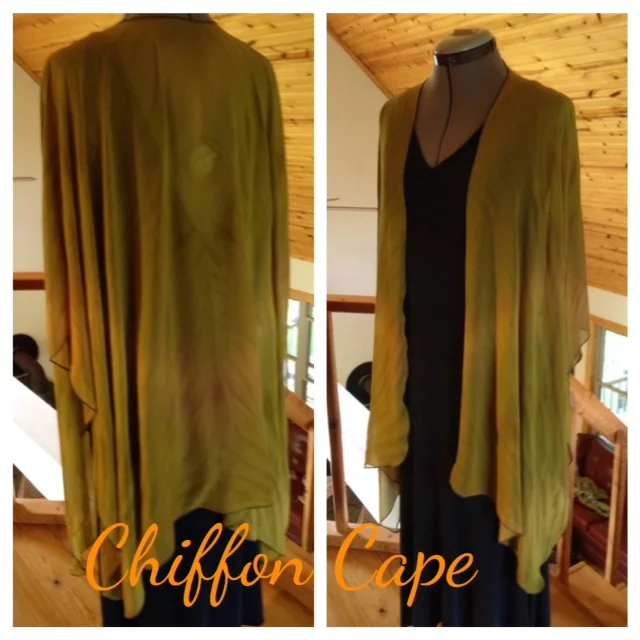 Forrest devore Cape. In order to make larger pieces for women of size I have added 12' to the center of each 44" fabric. Not only does the give it more width, it creates a band in the front opening. When using the pole wrap for shibori dyeing II used an olive and purple shade formula to dye this cape. The finished color reminds me of a winter forrest.